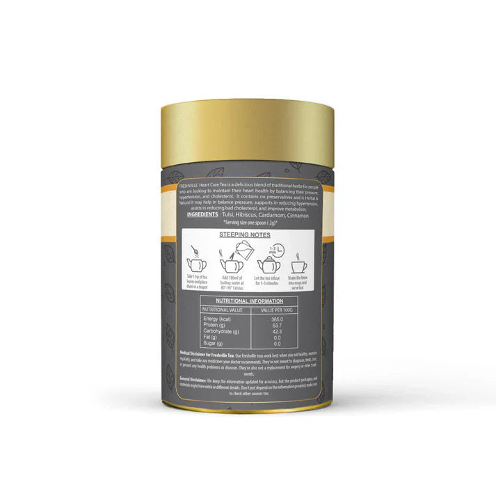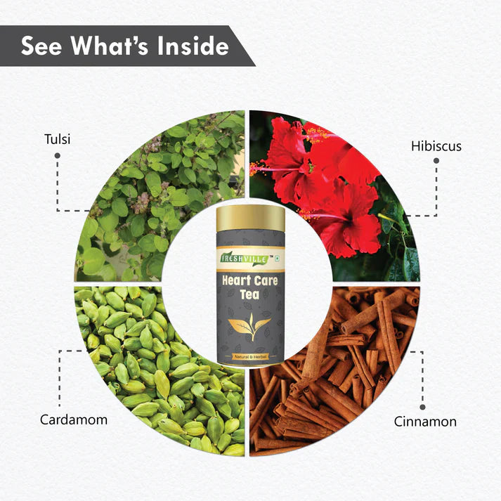 Support your heart naturally with Freshville Heart Care Tea. This soothing herbal blend of Tulsi, Cardamom, Cinnamon, and Hibiscus is crafted to promote cardiovascular wellness, regulate blood pressure, and help maintain healthy cholesterol levels. Rich in antioxidants, it strengthens heart muscles, improves circulation, and supports overall heart health. A caffeine-free and refreshing tea, perfect for daily wellness and long-term care.