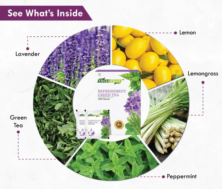 Rejuvenate your body and mind with Freshville Refreshment Green Tea Bags, a pure and natural blend crafted to boost immunity, enhance skin glow, and flush out toxins. Infused with the goodness of peppermint, lemon, lemongrass, lavender, and green tea, this refreshing mix offers a soothing aroma and revitalizing taste. Packed with antioxidants and essential nutrients, it promotes wellness while being completely gluten-free, caffeine-free, and vegan.