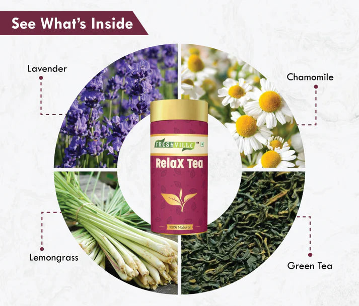 Unwind naturally with Freshville Relax Tea, a calming herbal blend designed to improve sleep quality and release stress. Crafted with a soothing mix of green tea, lemongrass, lavender, and chamomile, this infusion helps relax the mind, ease tension, and restore balance after a long day. Packed with antioxidants and essential nutrients, it supports overall wellness while being gluten-free, caffeine-free, and vegan.