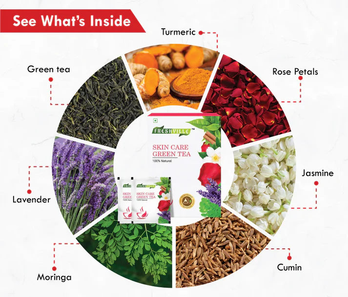 Nourish your skin from within with Freshville Skin Care Green Tea Bags (15 Bags). This unique Ayurvedic blend of Turmeric, Cumin, Lavender, Rose Petals, Jasmine, Moringa, and Green Tea works to promote glowing skin, boost immunity, and detoxify the body. Rich in antioxidants, it helps fight premature aging, reduce inflammation, and purify the blood naturally.