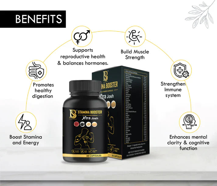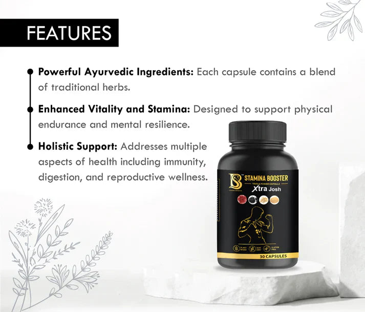 Boost your strength, stamina, and vitality with Stamina Booster Triple Power Capsule Xtra Josh. This Ayurvedic formulation is made with a powerful blend of 20 natural herbs, including Ashwagandha, Shatavari, Kaunch Beej, and Gokhru, to support endurance, energy, and overall well-being. Designed to enhance performance and confidence, it provides a safe, herbal solution without harmful chemicals.
